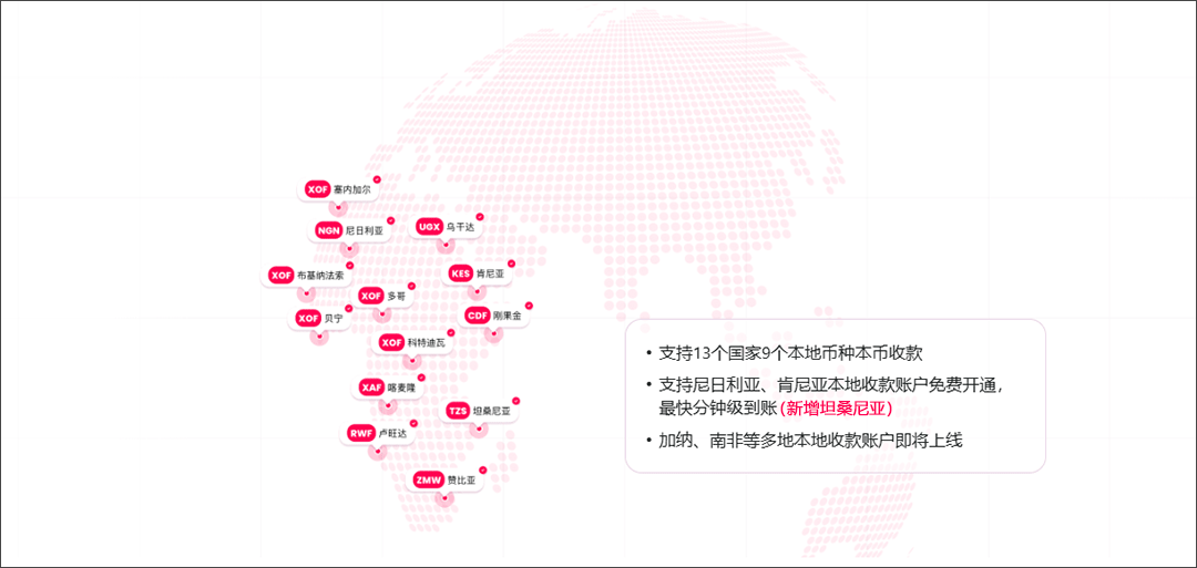 支持非洲13个国家 / 9种本币,非常适合小额、频繁的跨境收款场景。