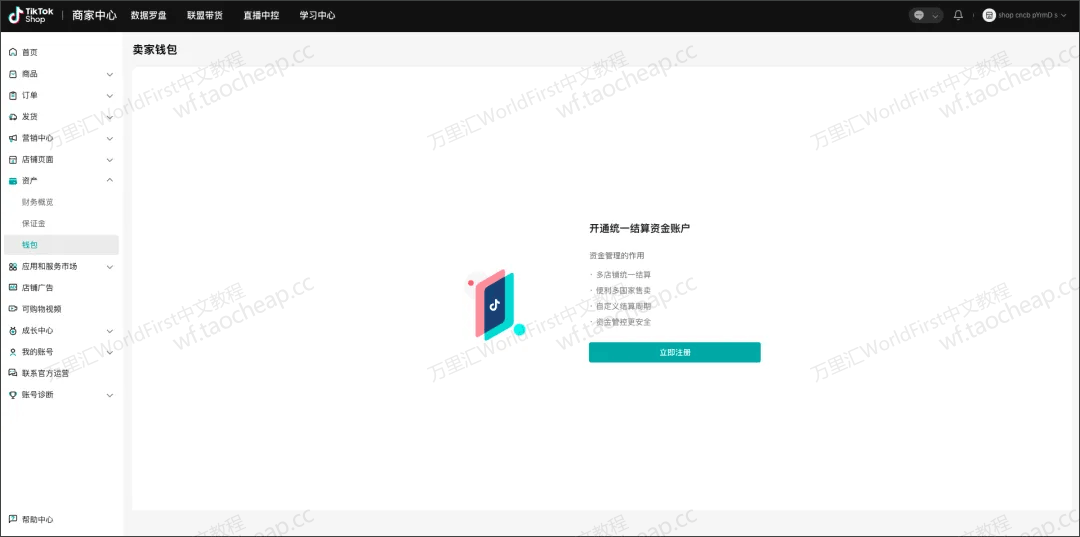 进入 TikTok Shop 卖家后台,在左侧菜单栏依次选择【资产】- 【钱包】;点击【立即注册】,并根据提示完成初始设置;
