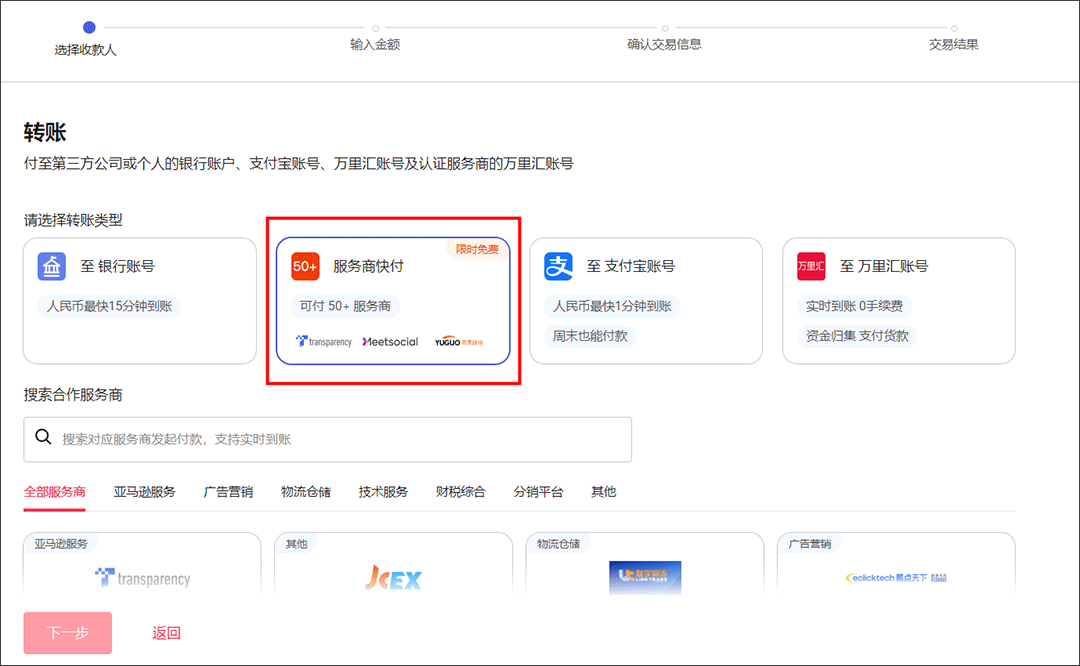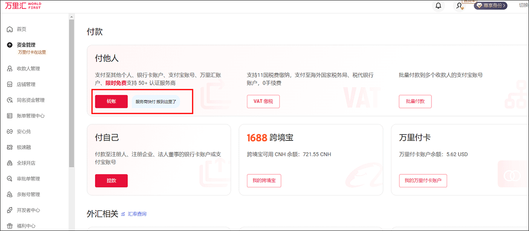 登录你的万里汇WorldFirst后台,进入【资金管理】-【转账】,点击【服务商快付】。